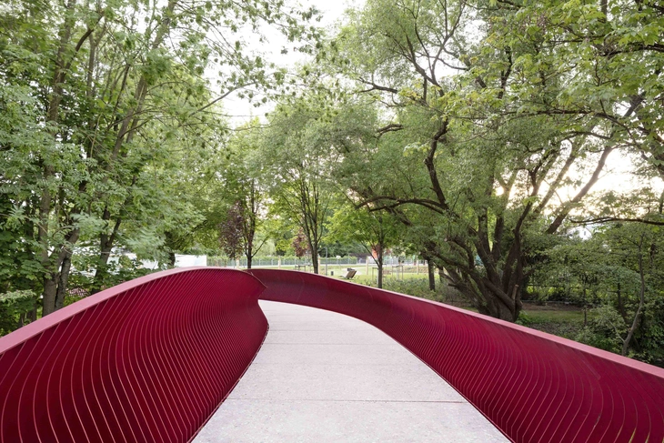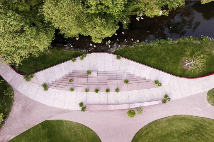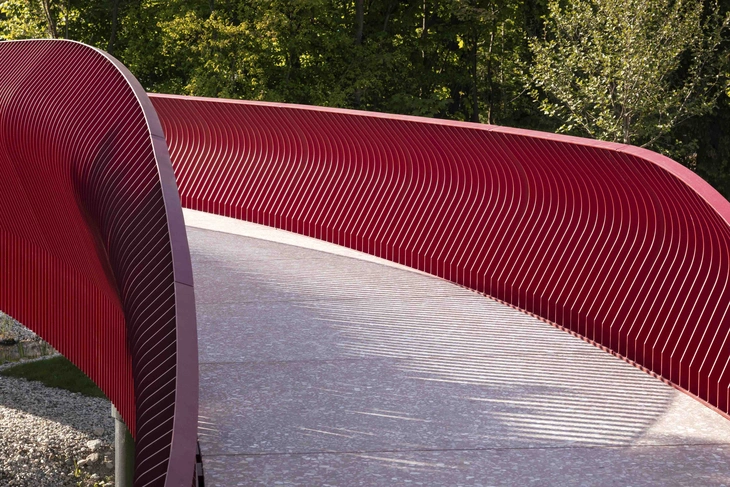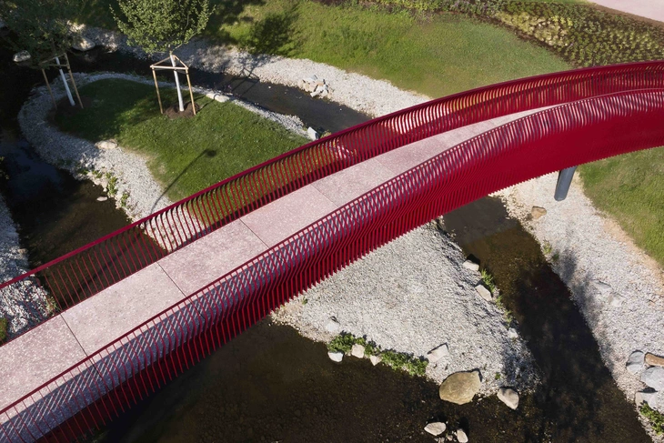 Mit dem Bau des „Drachenstegs“ zur Landesgartenschau – einem Rundgang mit Brücken, abgesteppten Terrassen und großzügigen Freiflächen – wurde ein innovatives Bauwerk geschaffen, bei dem Beton eine ganz wesentliche Rolle spielt und Modernität mit Tradition verbindet. Der Drachensteg, als Rundweg gestaltet, verbindet Grünflächen entlang der Kalten Pastritz und der Chamb, schafft neue Aufenthaltsräume am Flussufer und setzt dabei konsequent auf den Werkstoff Beton als Bodenbelag: Dessen kräftige, lebendige Rottönung symbolisiert Drachenblut – ein Sinnbild für Energie, Lebenskraft und Erneuerung. Dabei unterstützt das Farbkonzept die Narration des Weges als lebendige Brücke zwischen Grünflächen, Fluss und Stadt, zwischen Vergangenheit und Gegenwart. Skulptural und fast organisch wirkt die gesamte Architektur des Drachenstegs, der damit von einer reinen Wegführung zu einem Erlebnis von urbaner Dichte mit regionalem bzw. traditionellem Bezug wird.